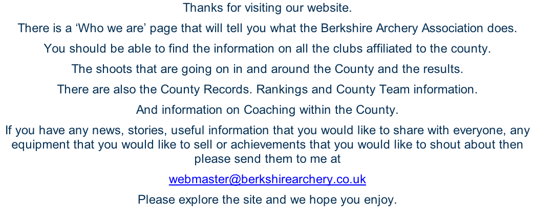 If you would like to be notified when the website is updated then please send me an email with your name and email address and I will add you to a mailing list send to webmaster@berkshirearchery.co.uk or click HERE